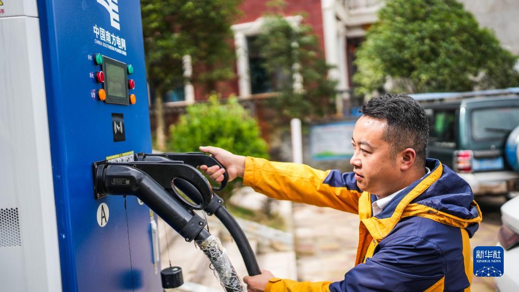 車(chē)主在六盤(pán)水市鐘山區青林苗族彝族鄉使用充電樁給新能源汽車(chē)充電(9月22日攝)。