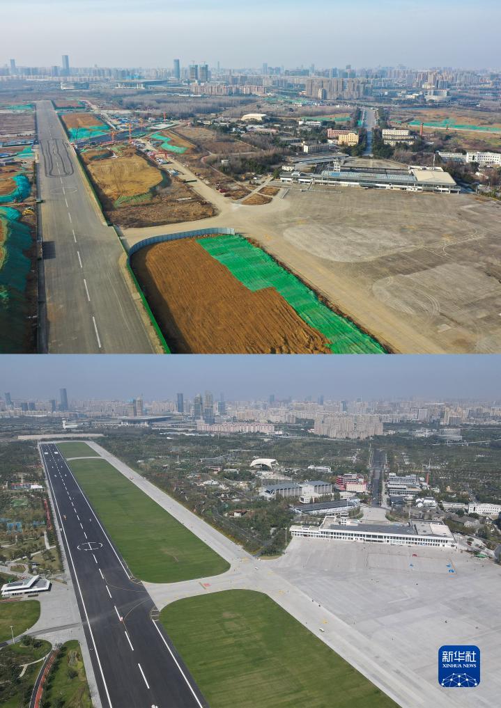 這是一張拼版照片:上圖為2021年2月9日拍攝的已停用的合肥駱崗機場(chǎng)(無(wú)人機照片,新華社發(fā) 黃洋洋攝);下圖為2023年10月17日拍攝的合肥駱崗公園(無(wú)人機照片,新華社記者周牧攝)。