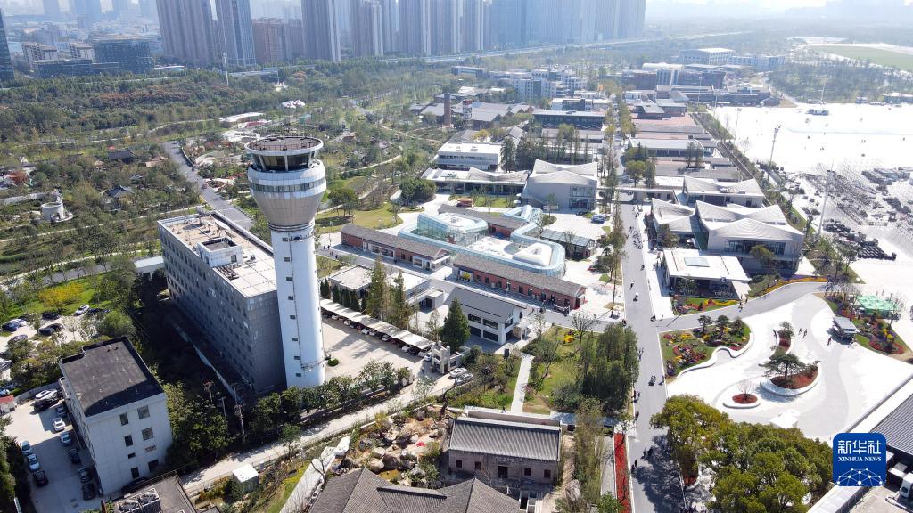 10月17日拍攝的合肥駱崗公園內的園博小鎮,該區域由原合肥駱崗機場(chǎng)辦公樓、宿舍區等改造而成(無(wú)人機照片)。