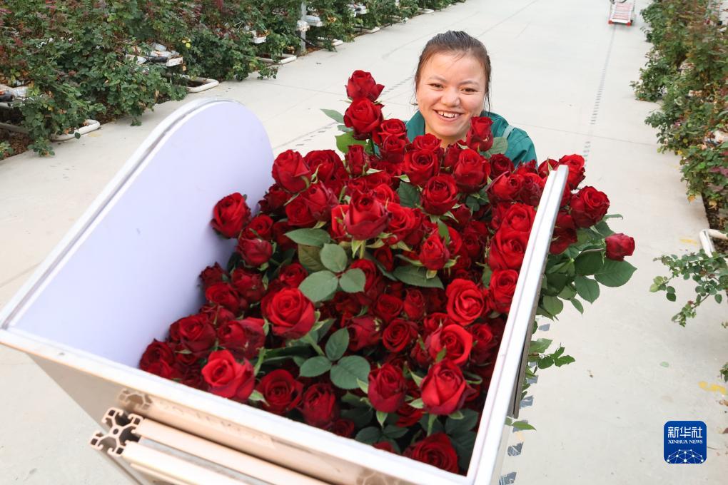 10月17日,在蘭州新區現代農業(yè)示范園花卉產(chǎn)業(yè)基地,務(wù)工人員采收玫瑰。