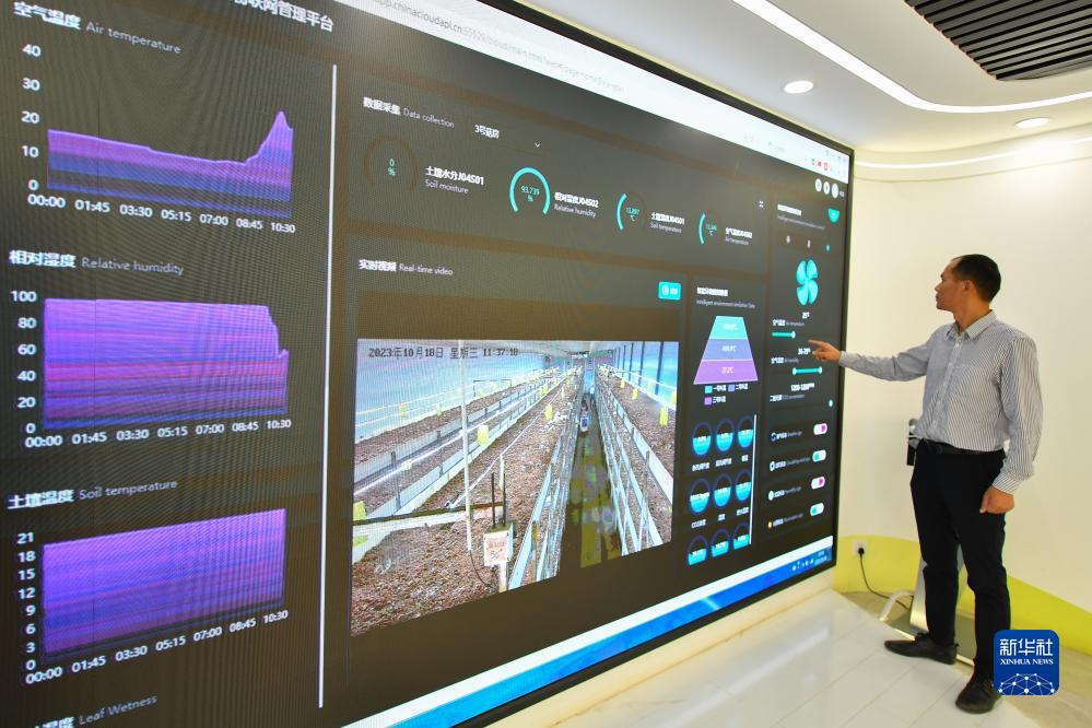10月18日,在湘潭市雨湖區姜畬鎮泉塘子村,一家食用菌生產(chǎn)企業(yè)的工作人員在介紹用于菇房管理的5G智慧農業(yè)物聯(lián)網(wǎng)系統。