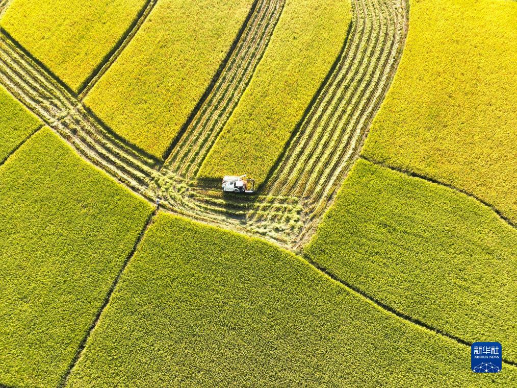 10月17日,湖南省常寧市三角塘鎮長(cháng)江村村民駕駛收割機收獲晚稻(無(wú)人機照片)。