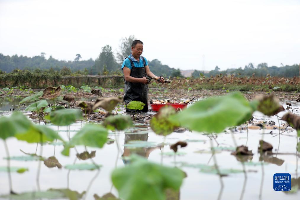 10月18日,在湖南省資興市唐洞街道鹿橋村,藕農在采收蓮藕。