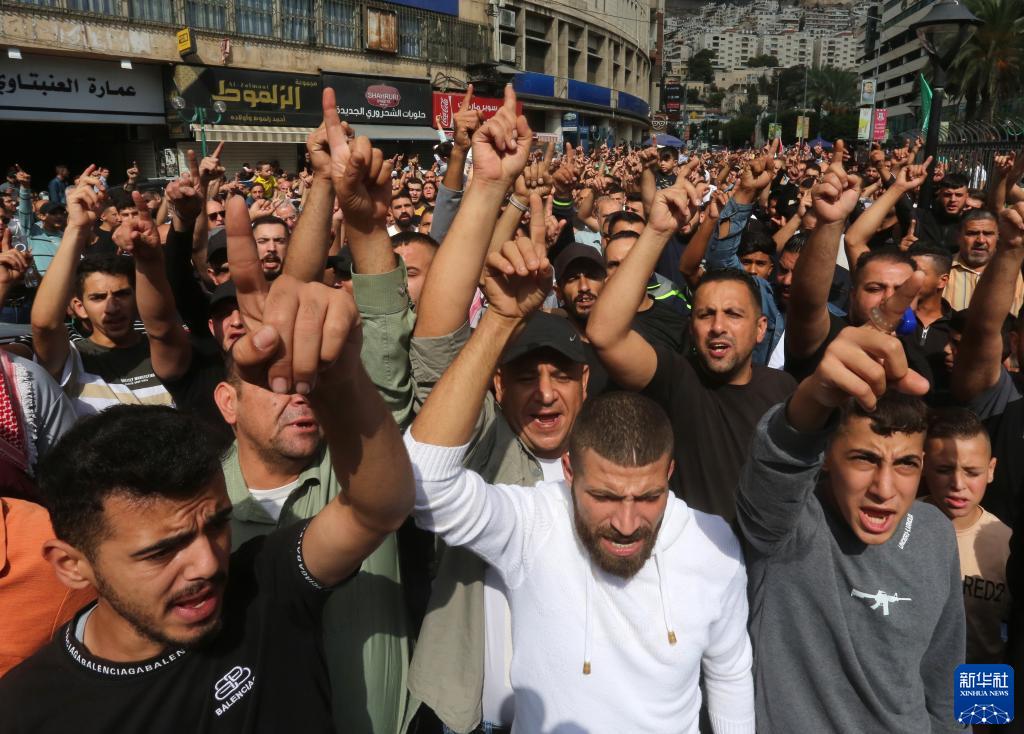 10月18日,在約旦河西岸城市納布盧斯,民眾上街游行抗議加沙醫院遭襲。