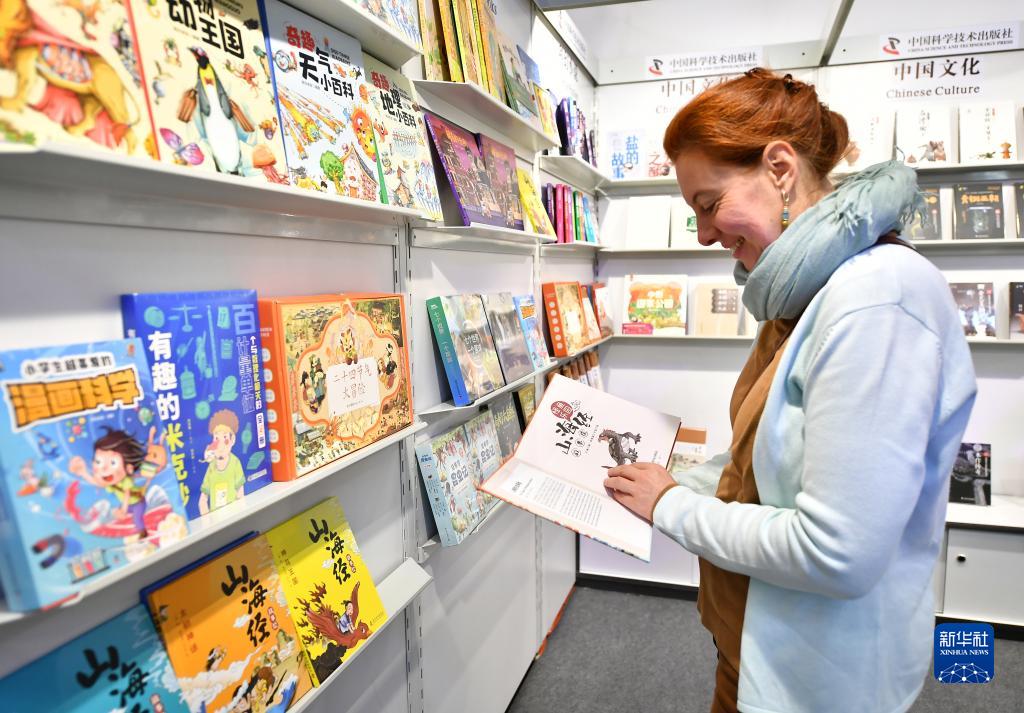 10月18日,一名參觀(guān)者在德國法蘭克福書(shū)展中國展區參觀(guān)。