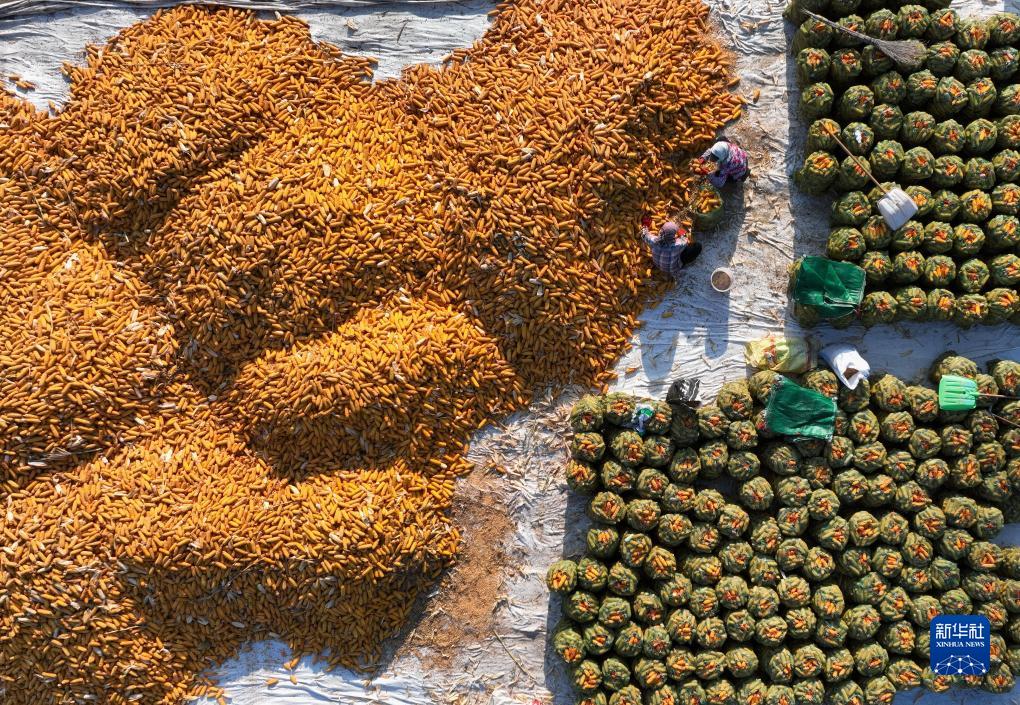 10月18日,唐山市豐南區王蘭莊鎮的農民將收獲的玉米裝袋、儲存(無(wú)人機照片)。