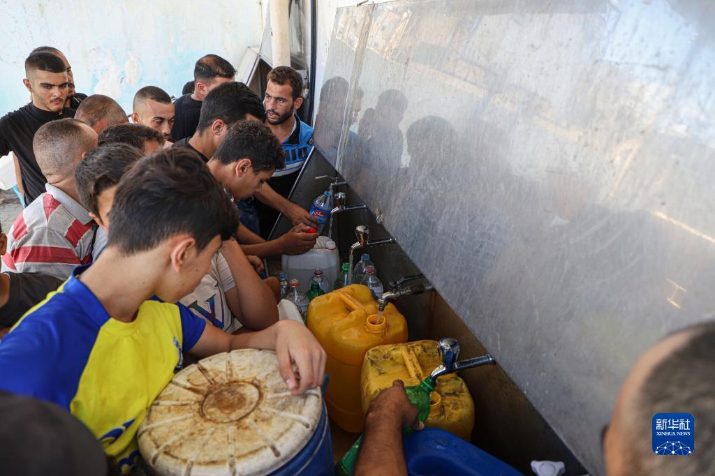 10月18日,在加沙地帶南部城市汗尤尼斯,人們接取生活用水。