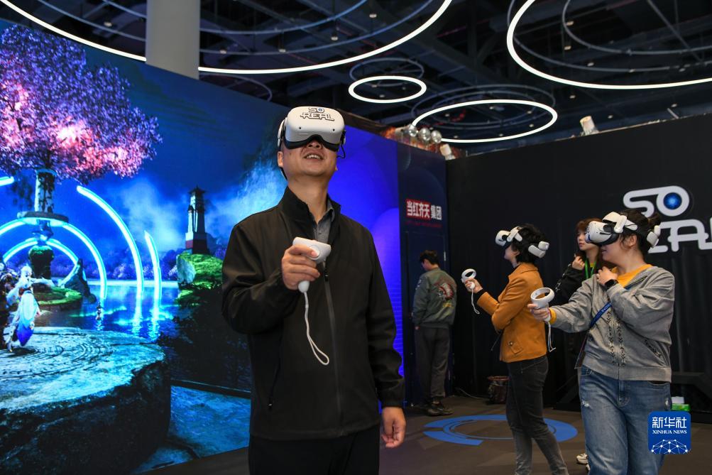 10月18日,觀(guān)眾在2023成都世界科幻大會(huì )主題展覽上體驗VR游戲。