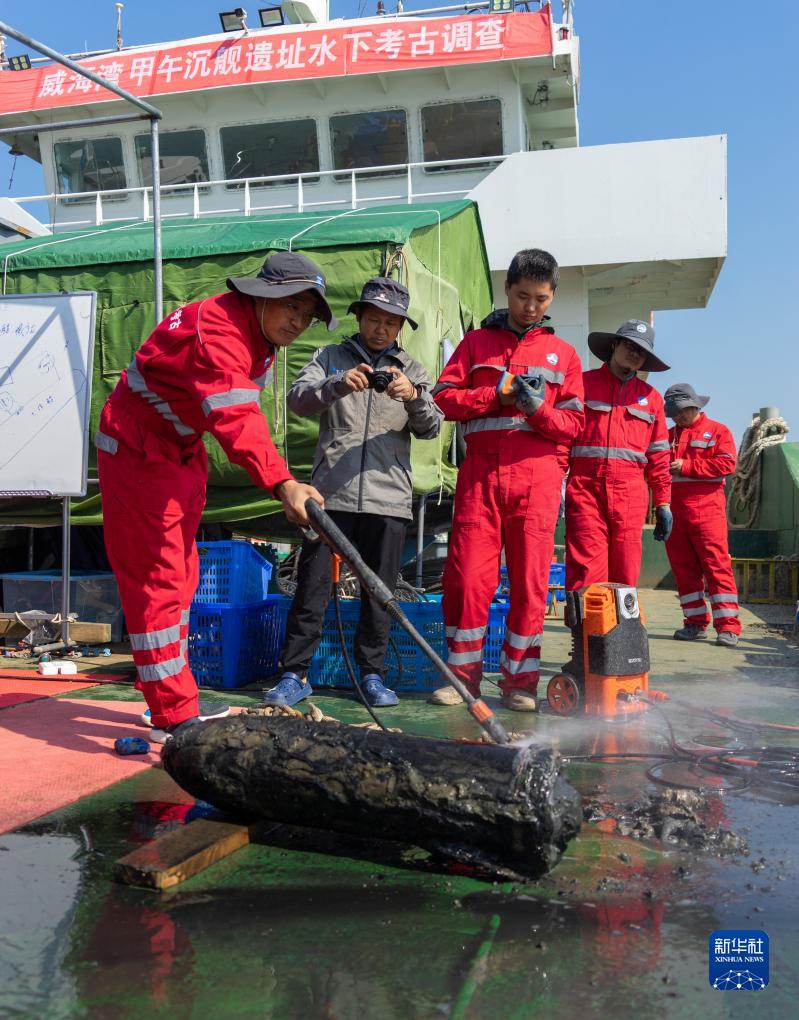 考古工作者在清洗出水的靖遠艦210毫米主炮彈。(2022年10月8日攝)。