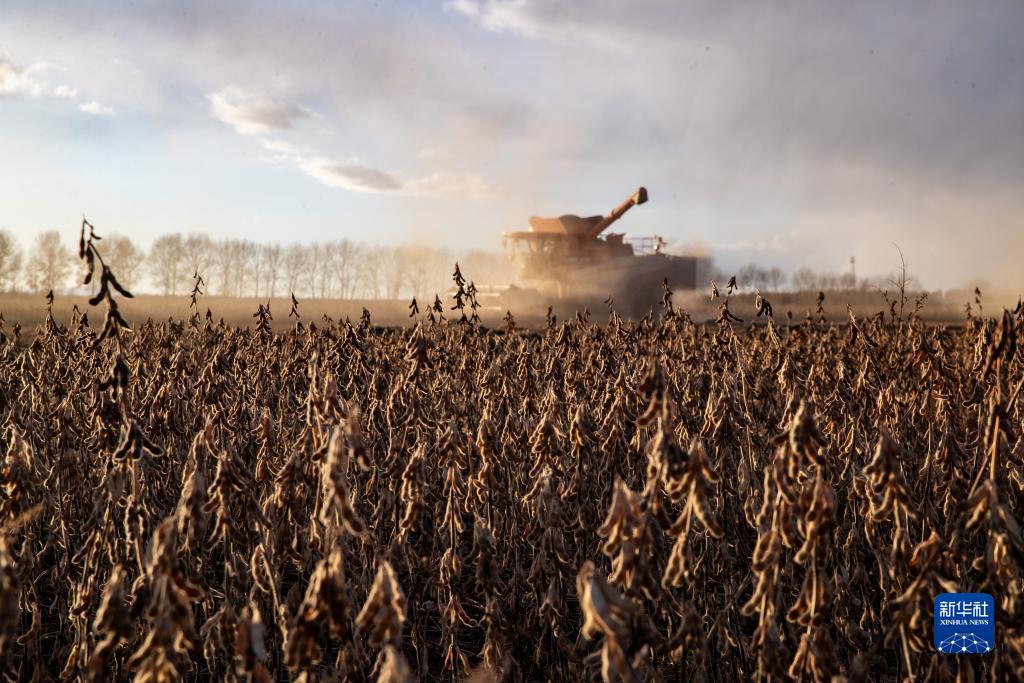 10月19日,收割機在齊齊哈爾市甘南縣中興鄉綠化村的一處大豆地收獲大豆。