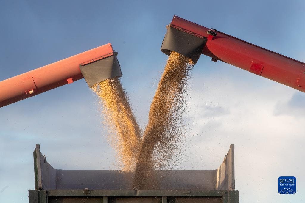 10月19日,在齊齊哈爾市甘南縣中興鄉綠化村的一處大豆地,收割機卸下剛剛收獲的大豆。