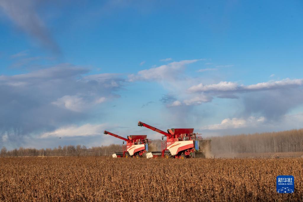 10月19日,收割機在齊齊哈爾市甘南縣中興鄉綠化村的一處大豆地收獲大豆。