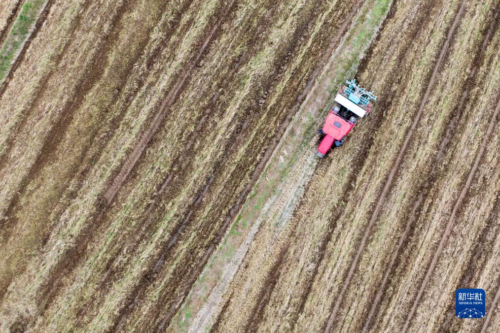 10月19日,在湖北省荊門(mén)市沙洋縣曾集鎮金雞村,五洋農機專(zhuān)業(yè)合作社社員操作機械設備播種油菜(無(wú)人機照片)。
