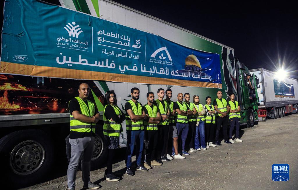 10月19日,在拉法口岸埃及一側,志愿者們站在裝載有人道援助物資的貨車(chē)前。