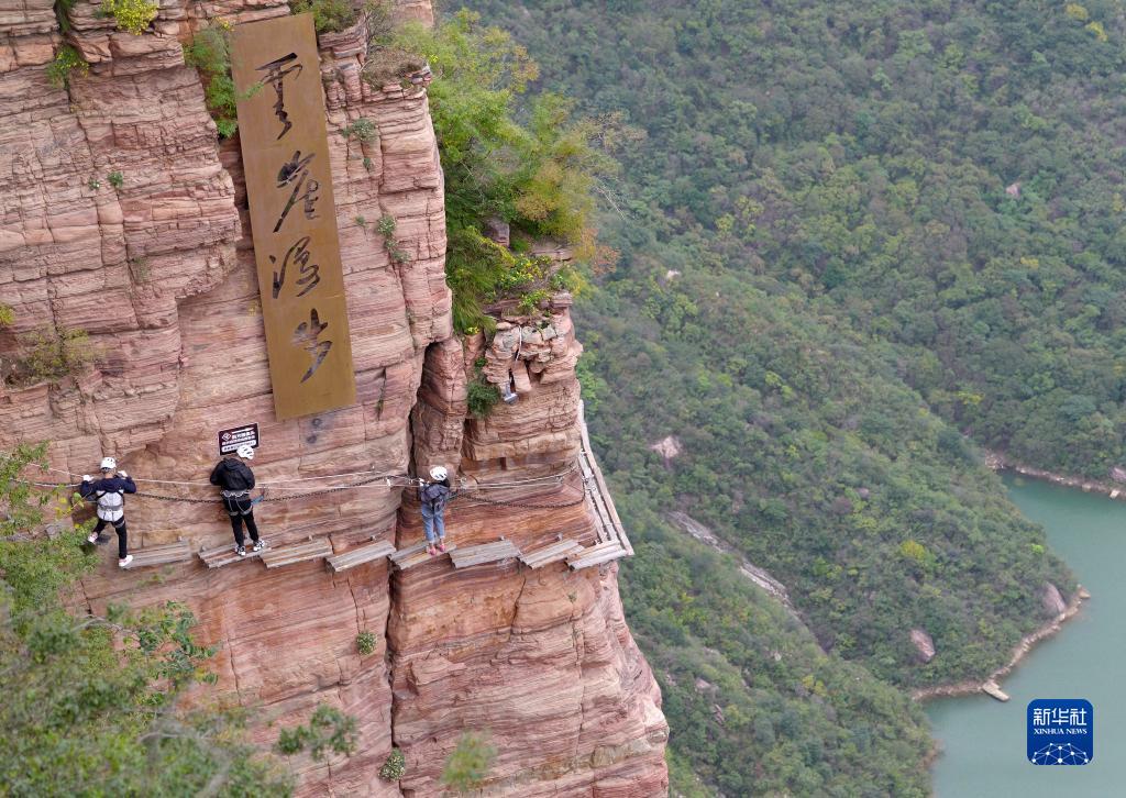 10月19日,游客在河南寶泉旅游度假區體驗“云崖漫步”項目。