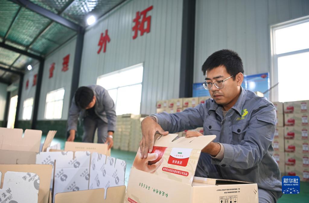 10月19日,一家果業(yè)公司的工作人員在南溝村整理紙箱,為蘋(píng)果采收做準備。