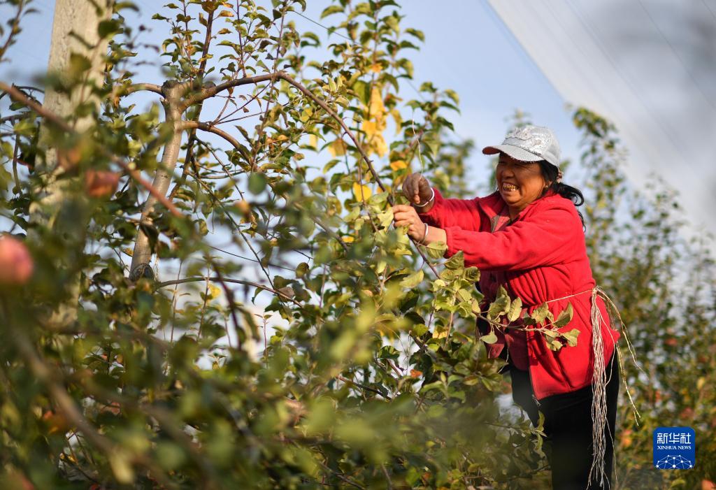 10月19日,果農在南溝村山地蘋(píng)果園管護果樹(shù)。