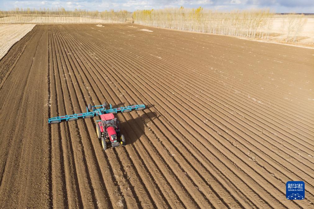 10月19日,在黑龍江省肇東市五里明鎮東升村,農民駕駛機械進(jìn)行鎮壓保墑作業(yè)(無(wú)人機照片)。