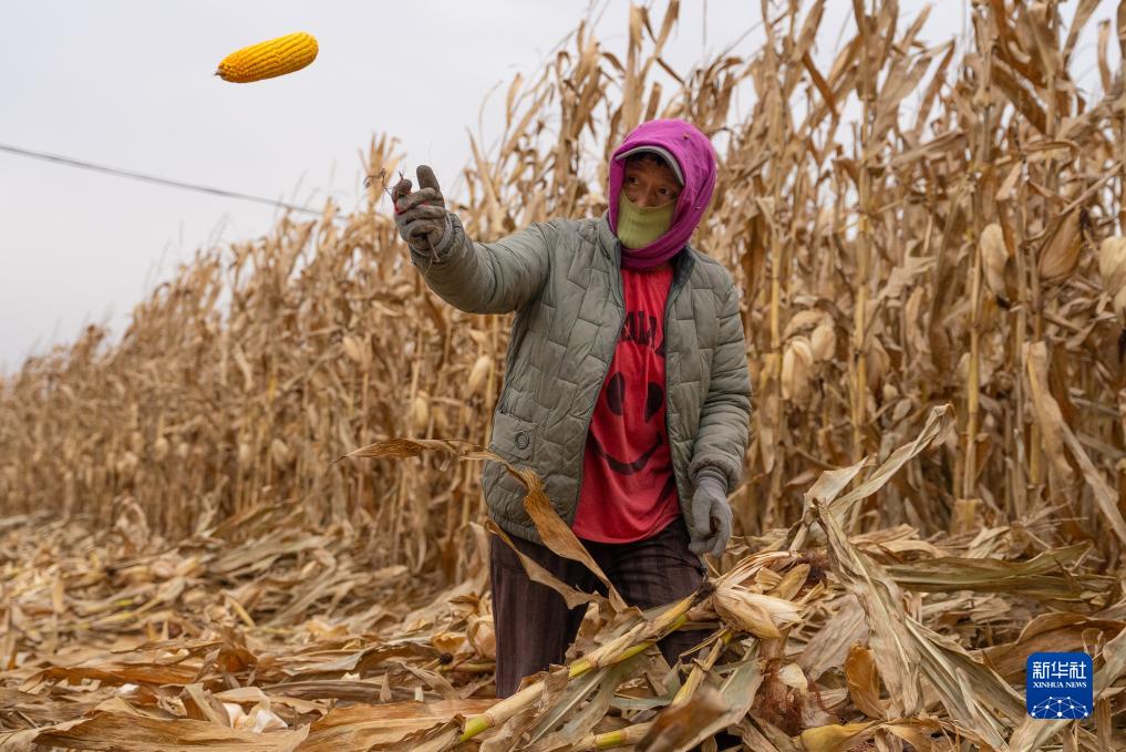 10月18日,在黑龍江省尚志市長(cháng)壽鄉,農民在玉米地中收獲玉米。