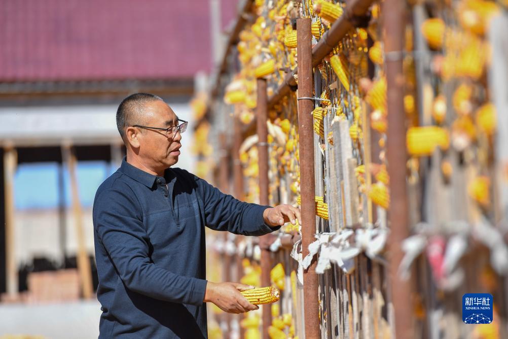 10月19日,在吉林省公主嶺市友忠種植農民專(zhuān)業(yè)合作社,理事長(cháng)孫友忠查看科學(xué)儲糧倉中的玉米儲存情況。