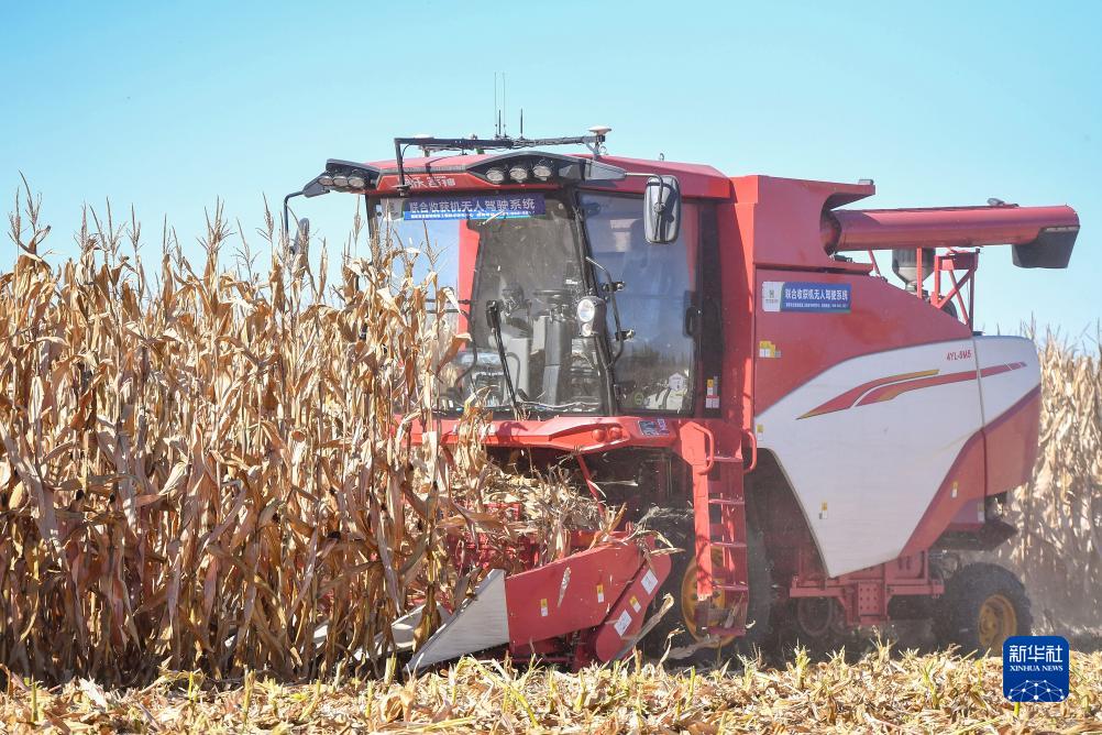 10月19日,在中國科學(xué)院“黑土糧倉”科技會(huì )戰長(cháng)春示范區公主嶺示范基地,無(wú)人駕駛農機在收獲玉米。