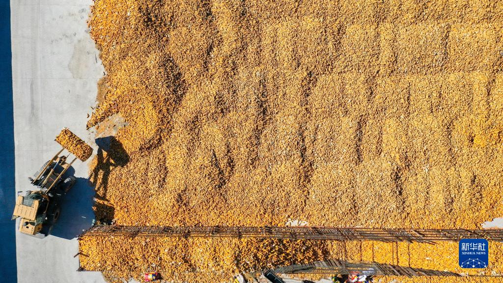 10月19日,在吉林省公主嶺市友忠種植農民專(zhuān)業(yè)合作社,農民將收獲的玉米放入科學(xué)儲糧倉(無(wú)人機照片)。