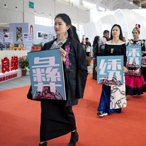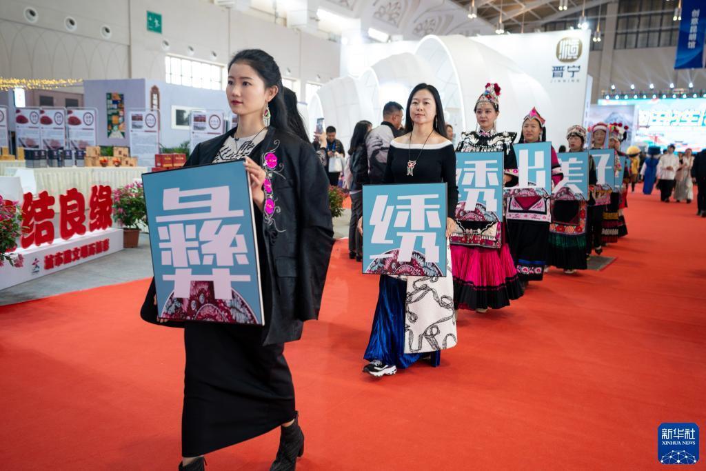 10月20日,參展工作人員在創(chuàng )意云南文化產(chǎn)業(yè)博覽會(huì )上展示彝繡服飾。