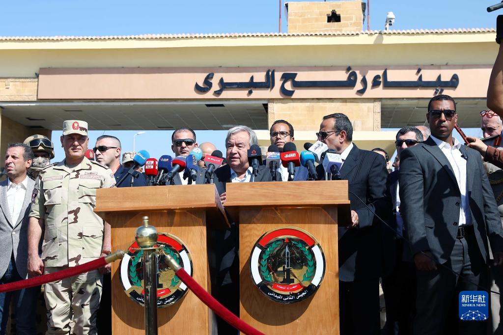 10月20日,在拉法口岸埃及一側,聯(lián)合國秘書(shū)長(cháng)古特雷斯(中)發(fā)表講話(huà)。新華社發(fā)(艾哈邁德·戈馬攝)