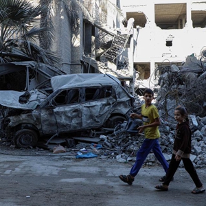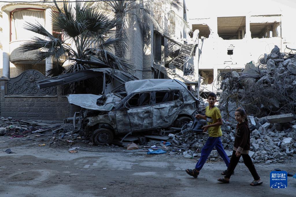 10月20日,在加沙地帶南部城市汗尤尼斯,兒童走過(guò)遭以色列襲擊損毀的建筑。