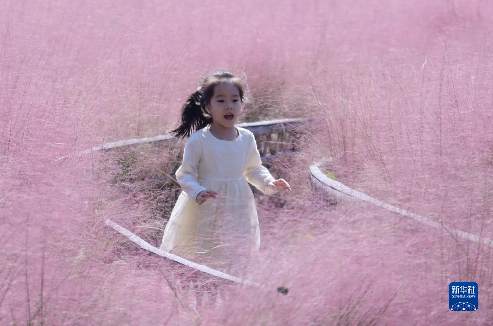 10月21日,一名小朋友在江蘇常州光伏產(chǎn)業(yè)公園粉黛亂子草叢間游玩。