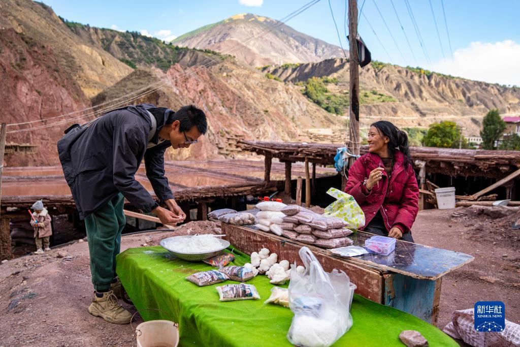 一名村民在西藏昌都市芒康縣納西民族鄉的鹽田旁向游客推銷(xiāo)自家產(chǎn)的鹽(10月20日攝)。