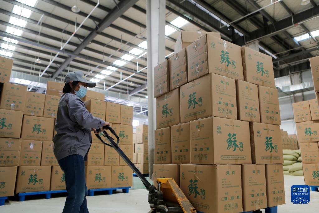 10月21日,在江蘇射陽(yáng)縣洋馬鎮銀寶菊花科技有限公司,工人在運輸包裝好的菊花產(chǎn)品。