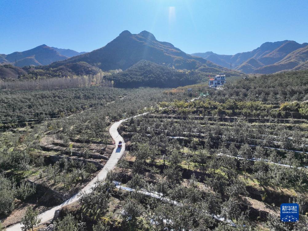 10月22日,在承德縣八家鄉深水河村一處標準化蘋(píng)果種植基地,農民在運送國光蘋(píng)果(無(wú)人機照片)。