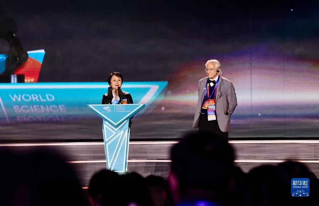 10月22日晚,在第81屆世界科幻大會(huì )閉幕式上,2023成都世界科幻大會(huì )專(zhuān)職主席梁效蘭(左)致辭。