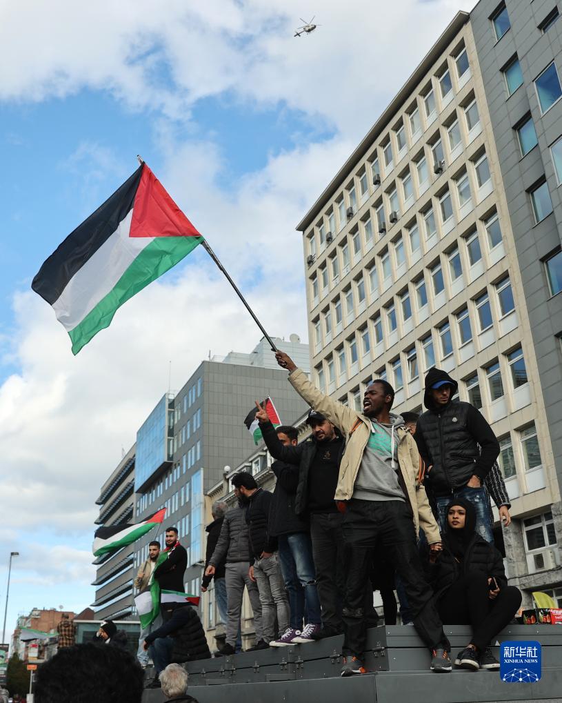當日,眾多巴勒斯坦支持者在位于比利時(shí)布魯塞爾的歐盟總部附近舉行集會(huì ),聲援巴勒斯坦。