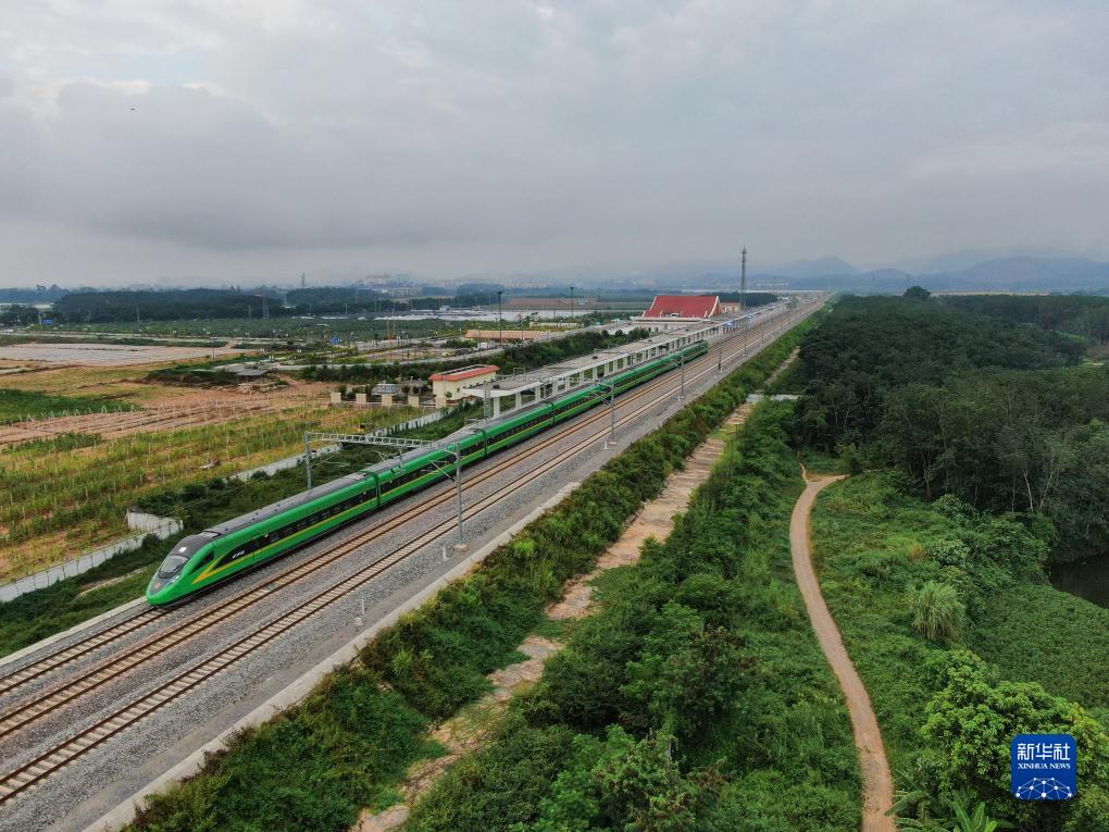 10月22日,動(dòng)車(chē)從位于云南省景洪市勐罕鎮的中老鐵路橄欖壩站駛出(無(wú)人機照片)。