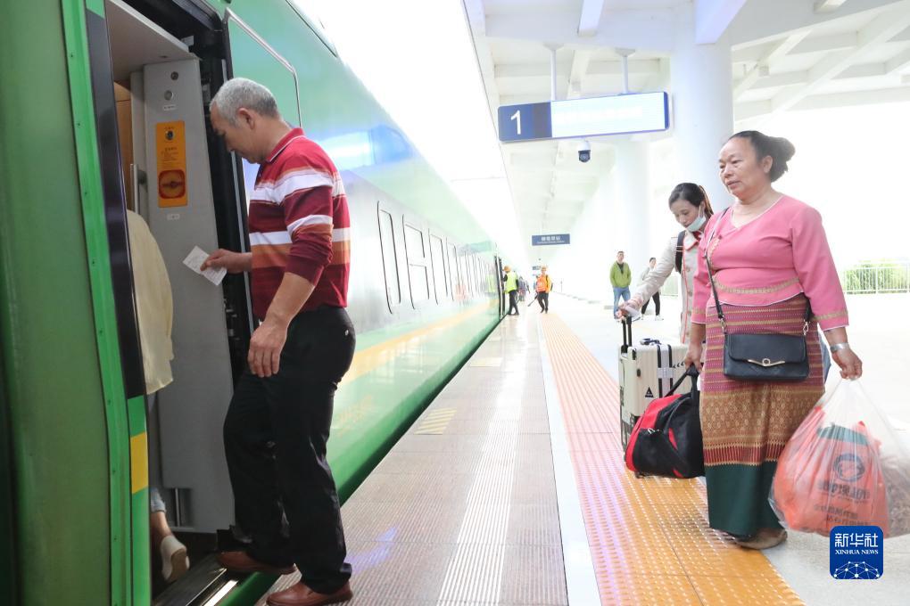 10月19日,云南省景洪市勐罕鎮曼聽(tīng)村村民咪么拉(右一)在中老鐵路橄欖壩站乘坐動(dòng)車(chē)出行。