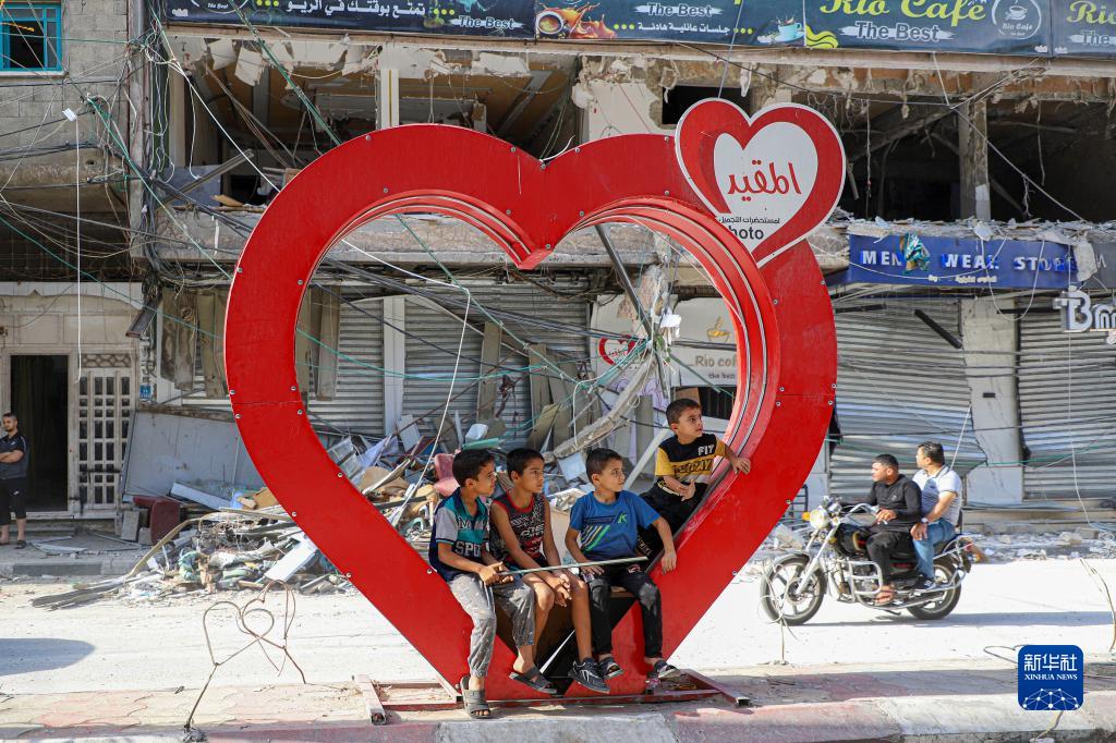 10月22日,在加沙地帶南部城市汗尤尼斯,幾名兒童坐在一處心型設施上,身后是遭以色列空襲損毀的建筑。