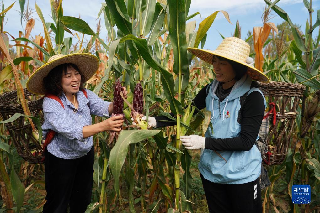 在北京市平谷區北臺頭村“博士農場(chǎng)”,王翠云(左)采摘玉米(10月4日攝)。