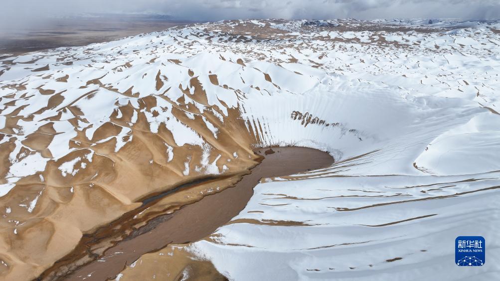 10月16日在阿爾金山國家級自然保護區拍攝的白雪覆蓋的大沙子泉(無(wú)人機照片)。