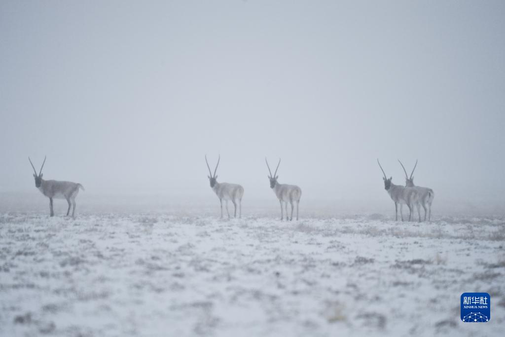 10月16日在阿爾金山國家級自然保護區拍攝的雪中的藏羚。