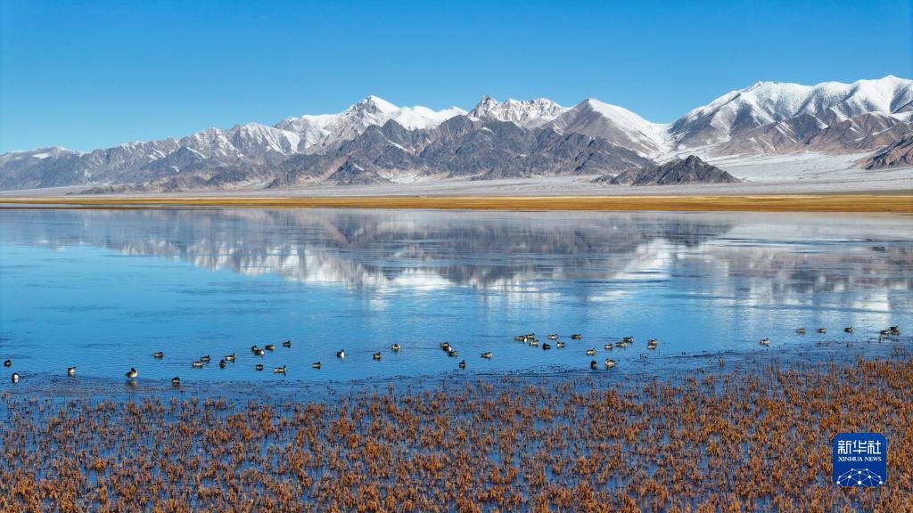 10月18日,在阿爾金山國家級自然保護區,針尾鴨等水鳥(niǎo)在依協(xié)克帕提湖棲息(無(wú)人機照片)。