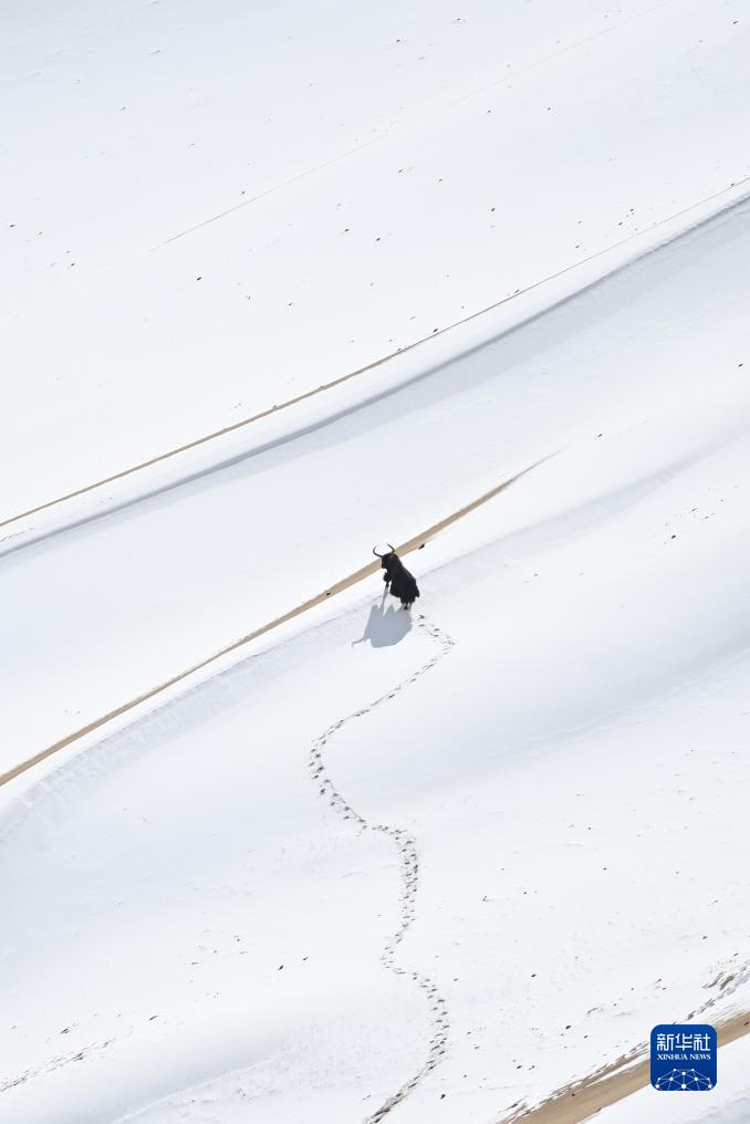 10月16日,在阿爾金山國家級自然保護區,野牦牛攀爬雪后的庫木庫里沙漠。