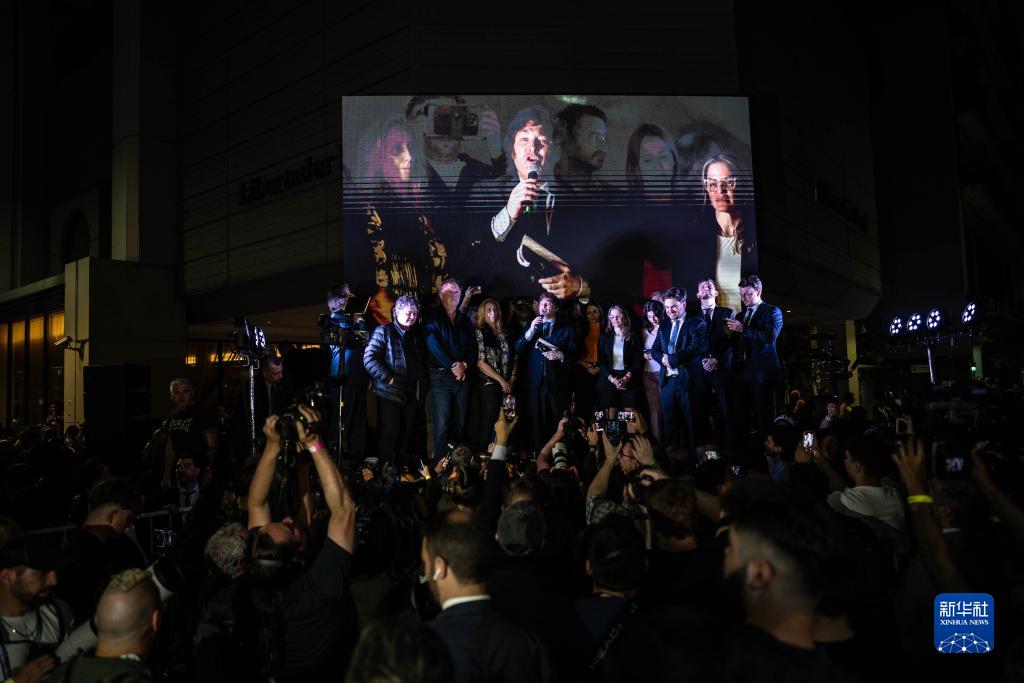 10月22日,阿根廷極右翼選舉聯(lián)盟“自由前進(jìn)黨”候選人、國會(huì )眾議員哈維爾·米萊(中)在位于首都布宜諾斯艾利斯的競選總部外發(fā)表演說(shuō)。