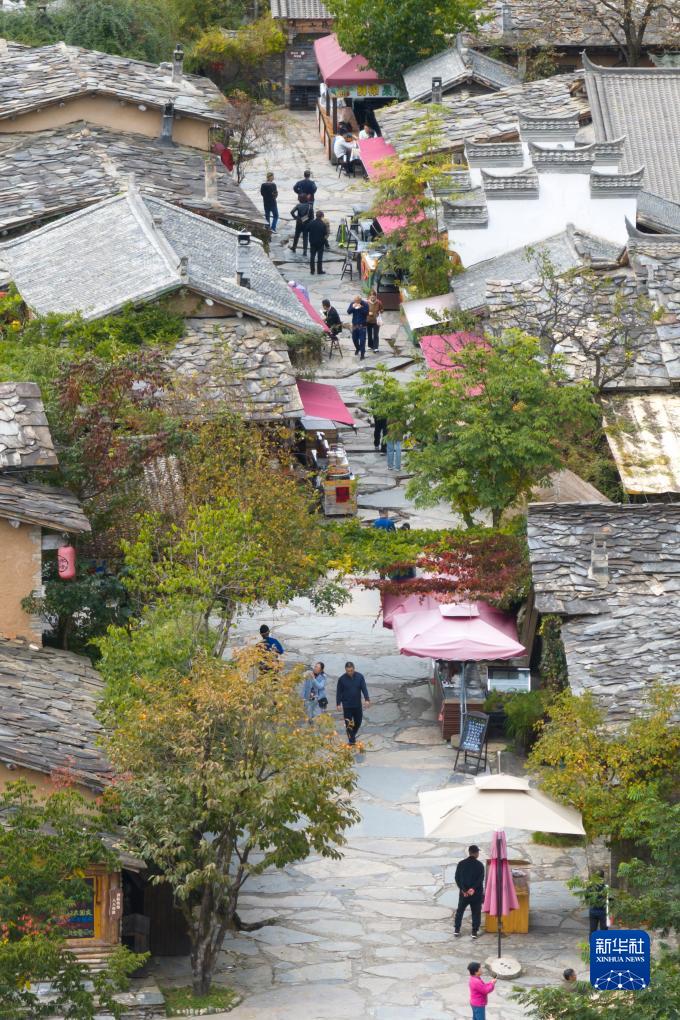 10月21日,游客在朱家灣村終南山寨民俗文化村內游覽(無(wú)人機照片)。