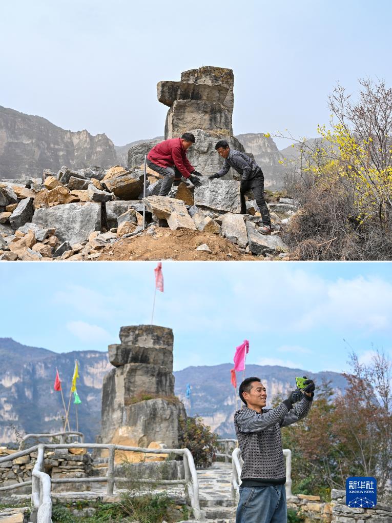 拼版照片:上圖為牛何松(右)和牛麗朋在太行山上搬運石塊(3月23日攝);下圖為牛何松在壺關(guān)縣大峽谷鎮青龍峽村一處修通的旅游路前拍照留念(10月18日攝)。