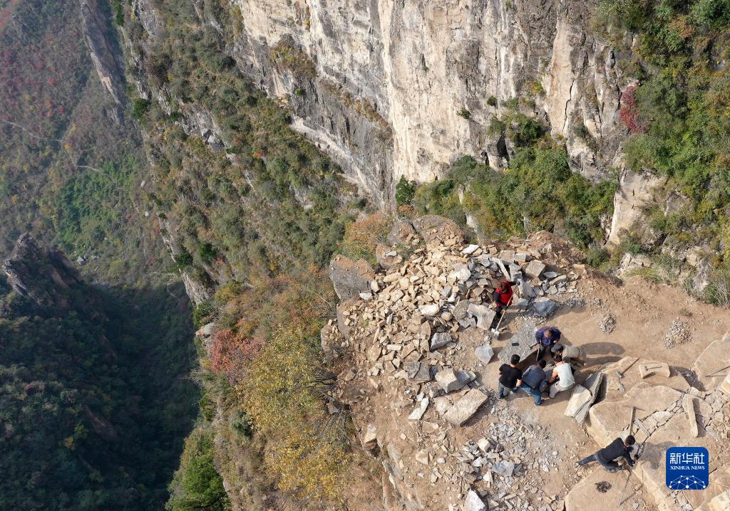村民們在山上修路(10月17日攝,無(wú)人機照片)。
