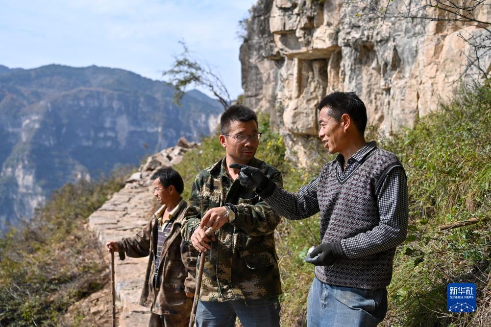 牛何松(右)向經(jīng)過(guò)的村民們描繪修通絕壁棧道帶來(lái)的觀(guān)光體驗(10月17日攝)。