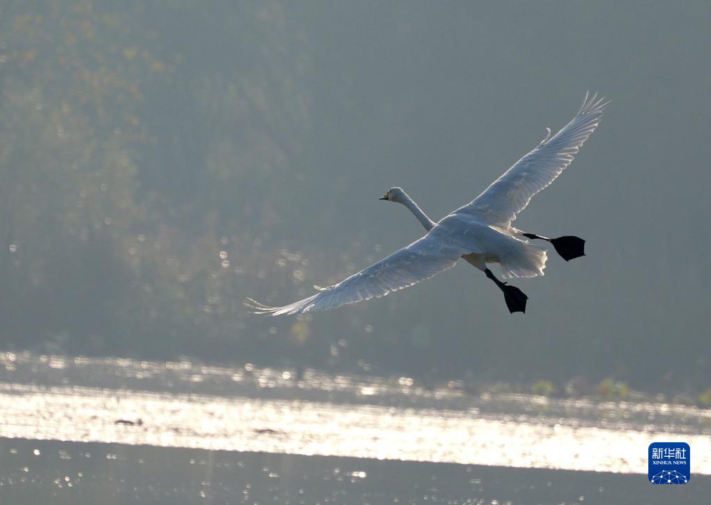 10月24日,大天鵝在三門(mén)峽市天鵝湖國家城市濕地公園內飛翔。