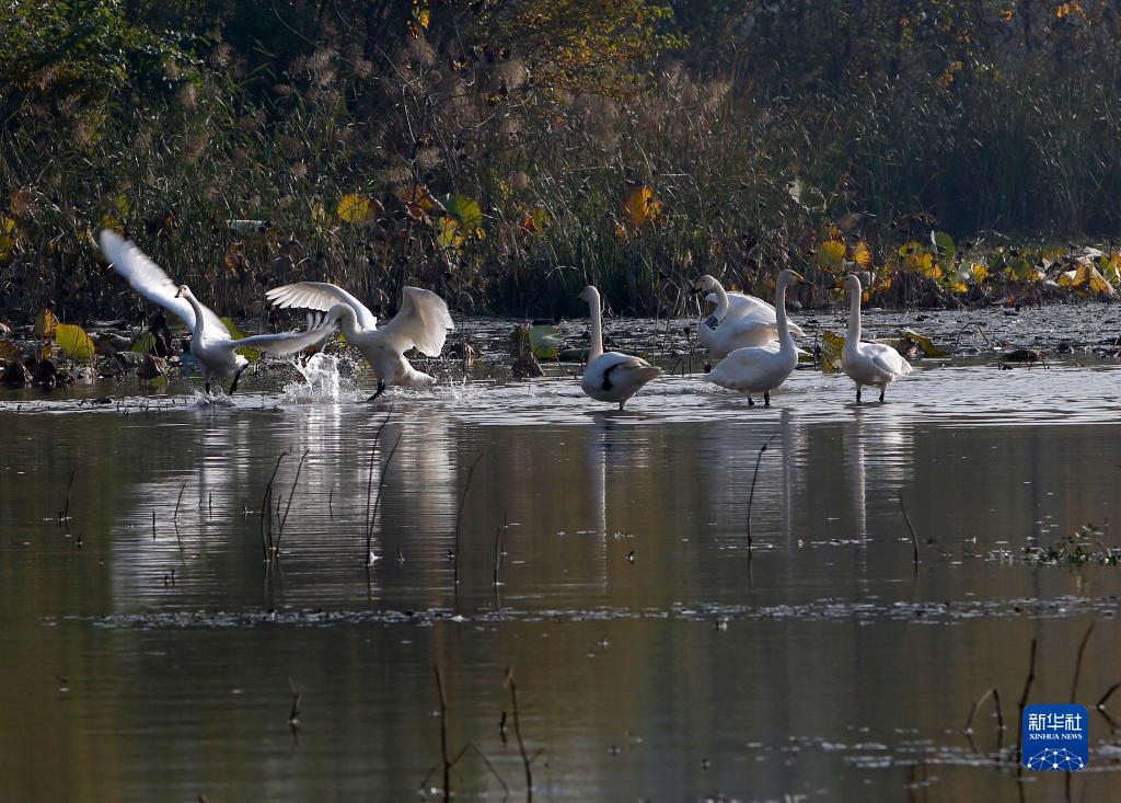 10月24日,大天鵝在三門(mén)峽市天鵝湖國家城市濕地公園內棲息。